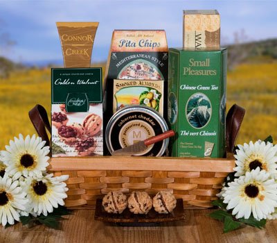 This tasteful soup gift basket arrives with everything needed for a fabulous 'Get Well' gift or a 'Warm Welcome Gift'. Generously filled with Connor Creek Old-Fashioned chicken noodle soup Mix (just add water-makes 8 servings), Dangold traditional water crackers, Jordan's Mediterranean Style all natural baked pita chips which are perfect for spreading on the Cabernet Sauvignon wine cheese with the small cheese knife that is included. Added to this gift is also a box of Los Olivos California Orchards smoked almonds and J&M Lime cookies and then some soothing Small Pleasures gourmet green teas and you have a "feel good all over" gift. (basket styles or products may be substituted)